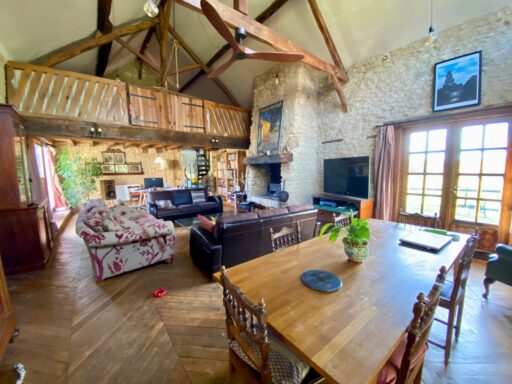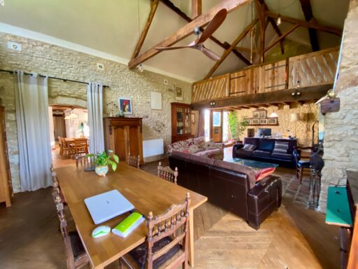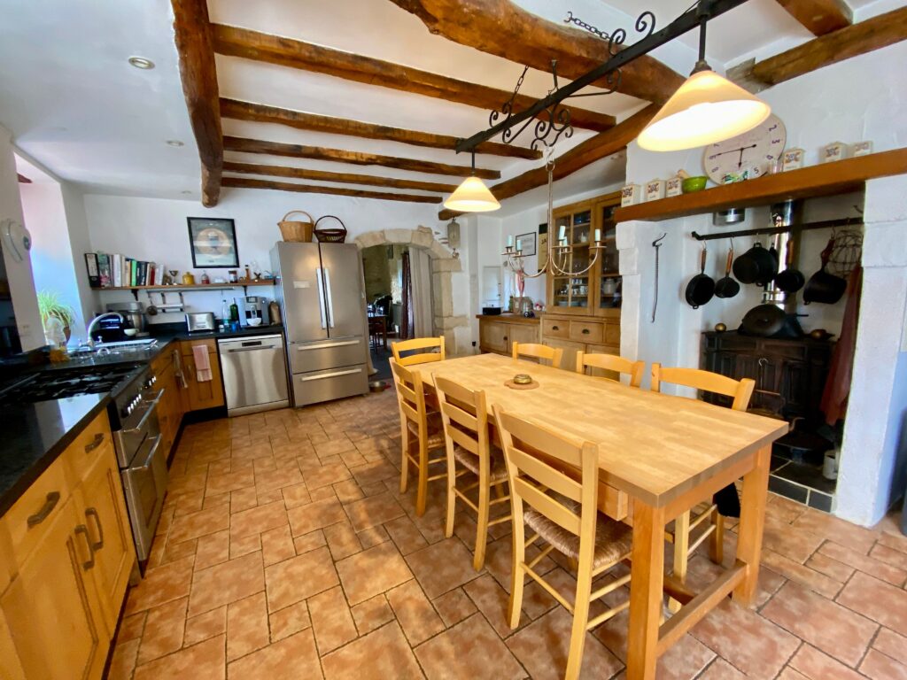 It features a large family kitchen, opening onto a spacious 50 sqm living room with a fireplace, exposed beams and a mezzanine, ideal for use as a home office, library or additional sleeping area.