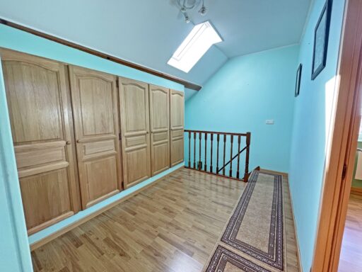 Upstairs, a landing leads to two large bedrooms and a shower room with a toilet.