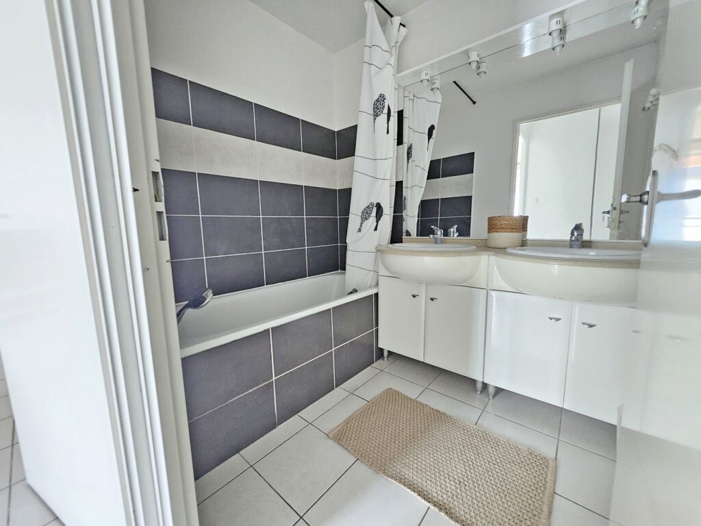 Il se compose d’une entrée avec placard, d’un séjour lumineux de 24 m² donnant sur un balcon, d’une cuisine équipée avec emplacements lave-linge et lave-vaisselle, de deux chambres avec placards/dressings (11 m² et 10 m²), d’une salle de bain avec double vasque et baignoire/douche, et d’un WC indépendant.