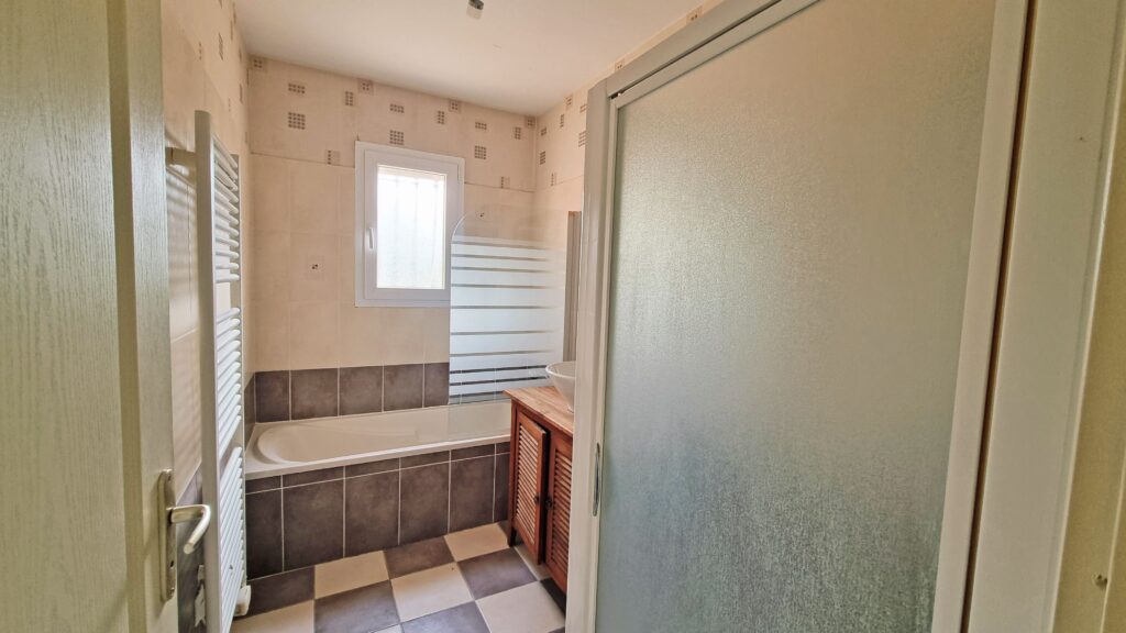 🛌 CĂ´tĂ© nuit, la maison offre trois belles chambres, une salle de bains Ă©quipĂ©e Ă  la fois d’une baignoire et d’une douche. PrĂ©sence d’un wc indĂ©pendant.