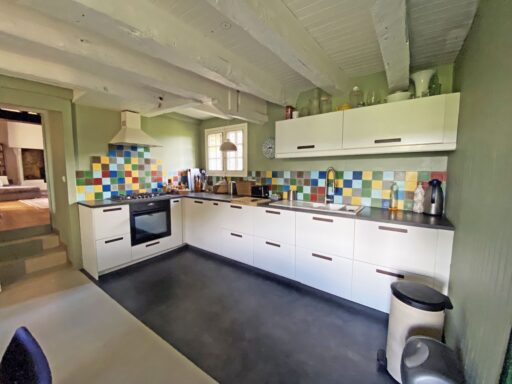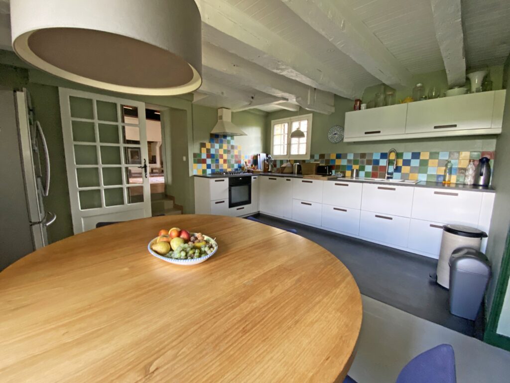 Au rez-de-chaussée, vous découvrirez un vaste salon chaleureux, agrémenté d’une grande cheminée équipée d’un poêle à bois, idéal pour les soirées d’hiver. La cuisine moderne, spacieuse et fonctionnelle, permet également d’y installer un coin repas convivial. Une pièce attenante, aujourd’hui utilisée comme atelier, offre la possibilité d’aménager facilement une chambre supplémentaire selon vos besoins.